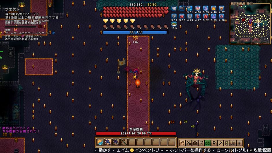 女帝蜘蛛は非常に速い。毒液が地面に残って安全地帯が減っていくので、狭い場所で戦うと逃げ場がなくなる。鉄爆弾やダイナマイトで十分な広さの戦闘エリアを確保してから戦闘を開始するのが鉄則。筆者は初戦で整地をサボった結果、女帝蜘蛛が壁に隠れて攻撃が当たらず一方的にやられた。
